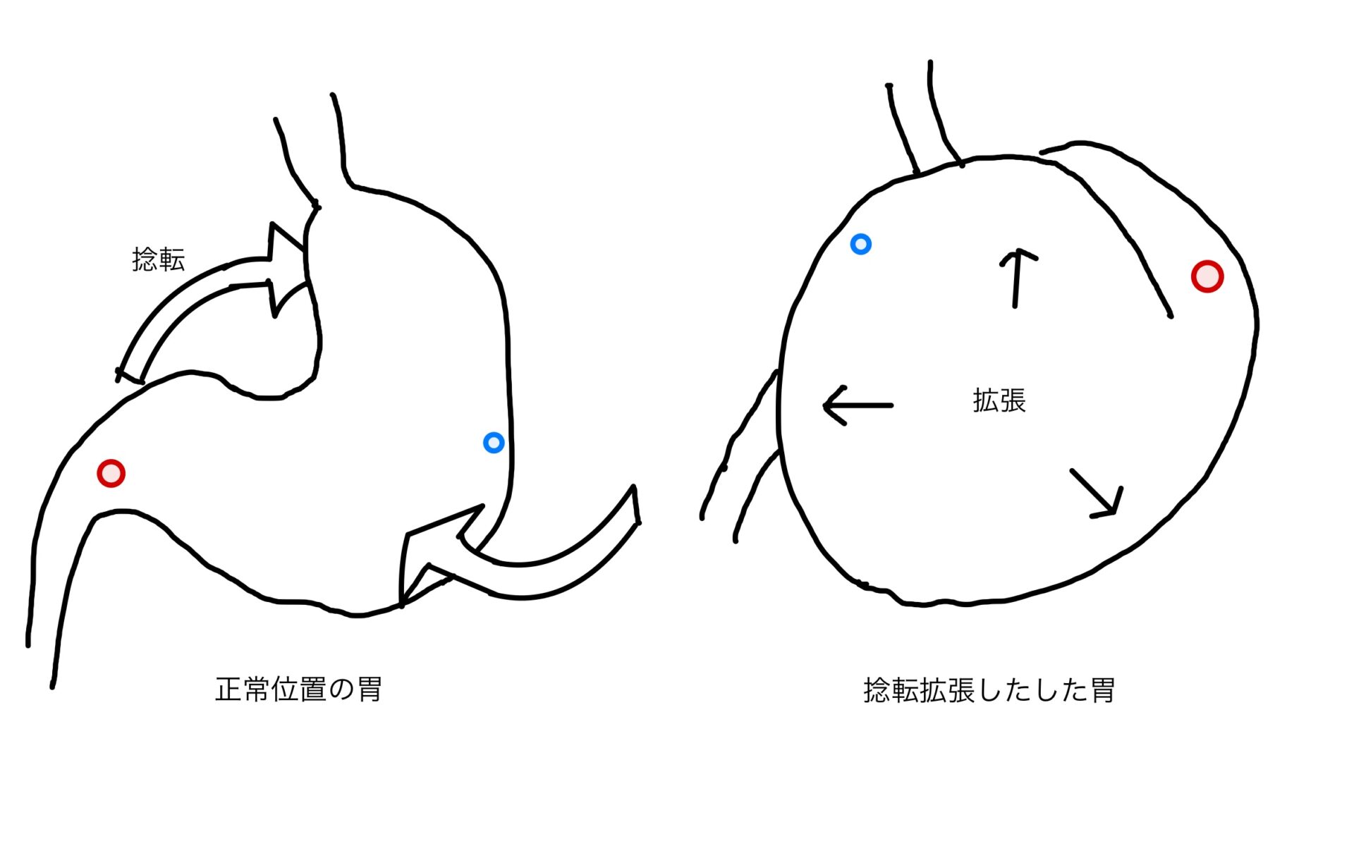 胃が捻転すると、胃や脾臓への血流が障害されるだけでなく、拡張した胃が大血管(後大静脈など)を圧迫し、心臓へ戻る血液量が減少してショック状態に陥ります。