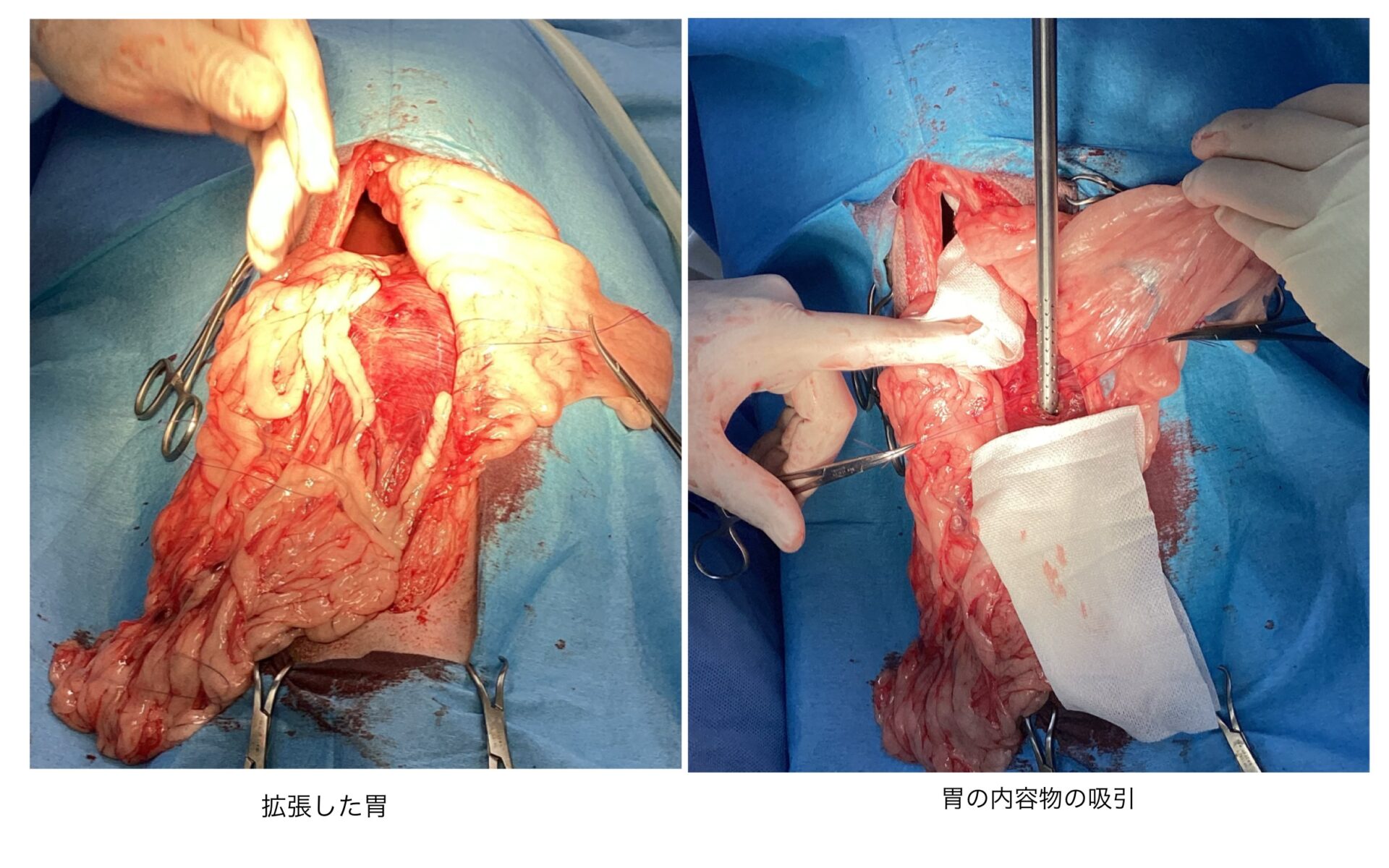 胃内のガス、内容物を胃切開により吸引除去し縫合後、胃の位置の整復を行いました。